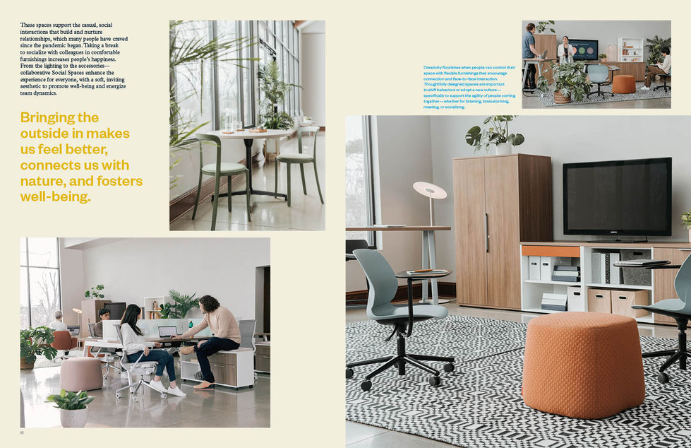 The Social Spaces Catalog embodies a refined visual language rooted in warmth, tactility, and fluidity—merging hospitality cues with workplace performance—while also reflecting diverse design points of view from celebrated designers around the world. The catalog presents environments composed through layered textures, soft tonal palettes, and curated contrast, where natural light, organic materials, and sculptural silhouettes guide rhythm and movement across the space. The typography is clean and contemporary, acting as a quiet, while photography emphasizes human scale, comfort, and atmosphere. The look and feel are elevated yet approachable, blending modern design icons with crafted finishes to create spaces that are intuitive, emotionally resonant, and rooted in storytelling—spaces that feel lived-in, expressive, and deeply human, shaped by the collective artistry of global design voices.